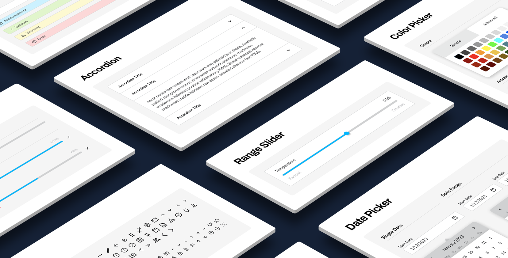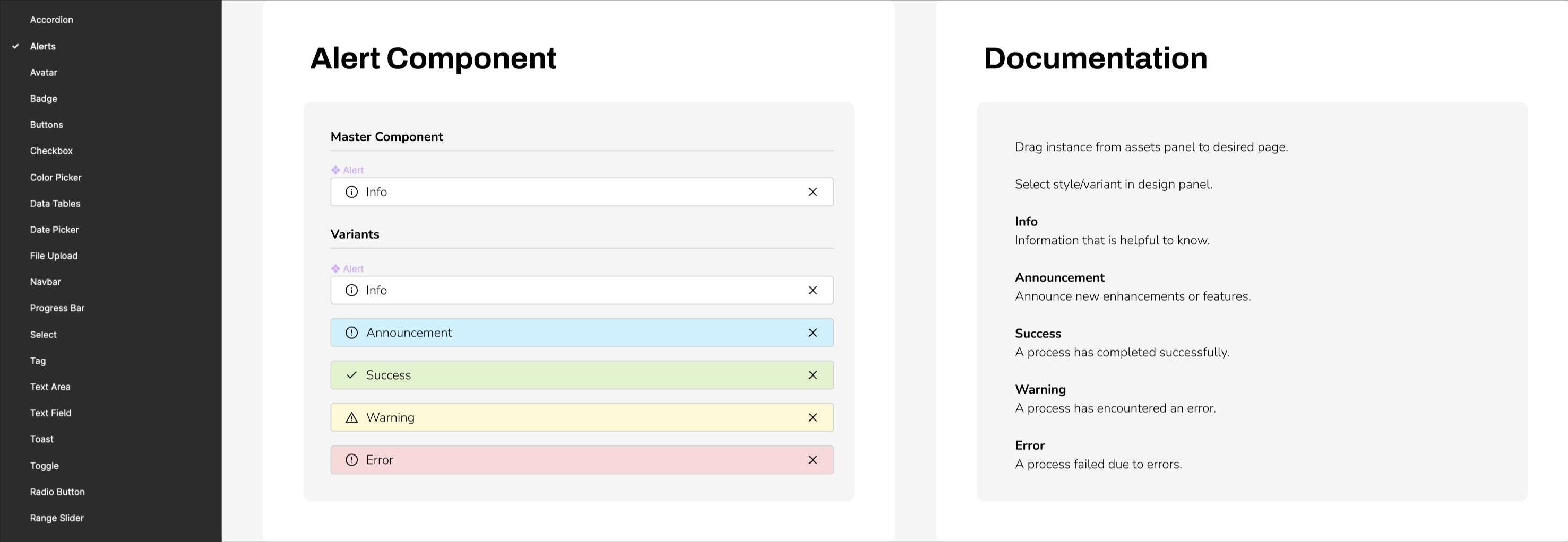 Example of how quickly you can customize instances using the properties mentioned above.Each component has a designated page with component, variants, and design documentation.